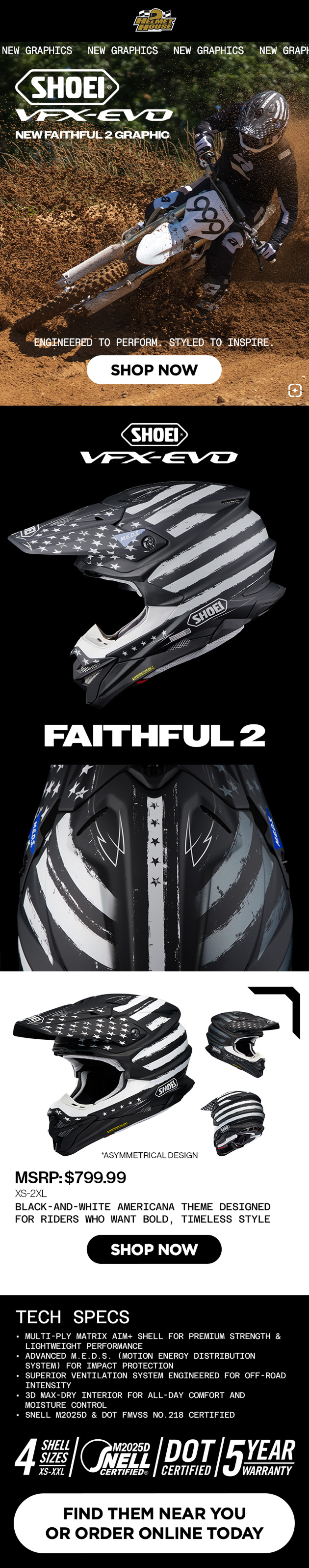 For the new SHOEI VFX Evo Faithful 2 graphic, I created marketing assets across both digital and print platforms. We ran paid ads and organic posts across multiple well known moto accounts including RacerX, Dirtbike Magazine, MXA, and more. I also created email marketing through Helmet House.